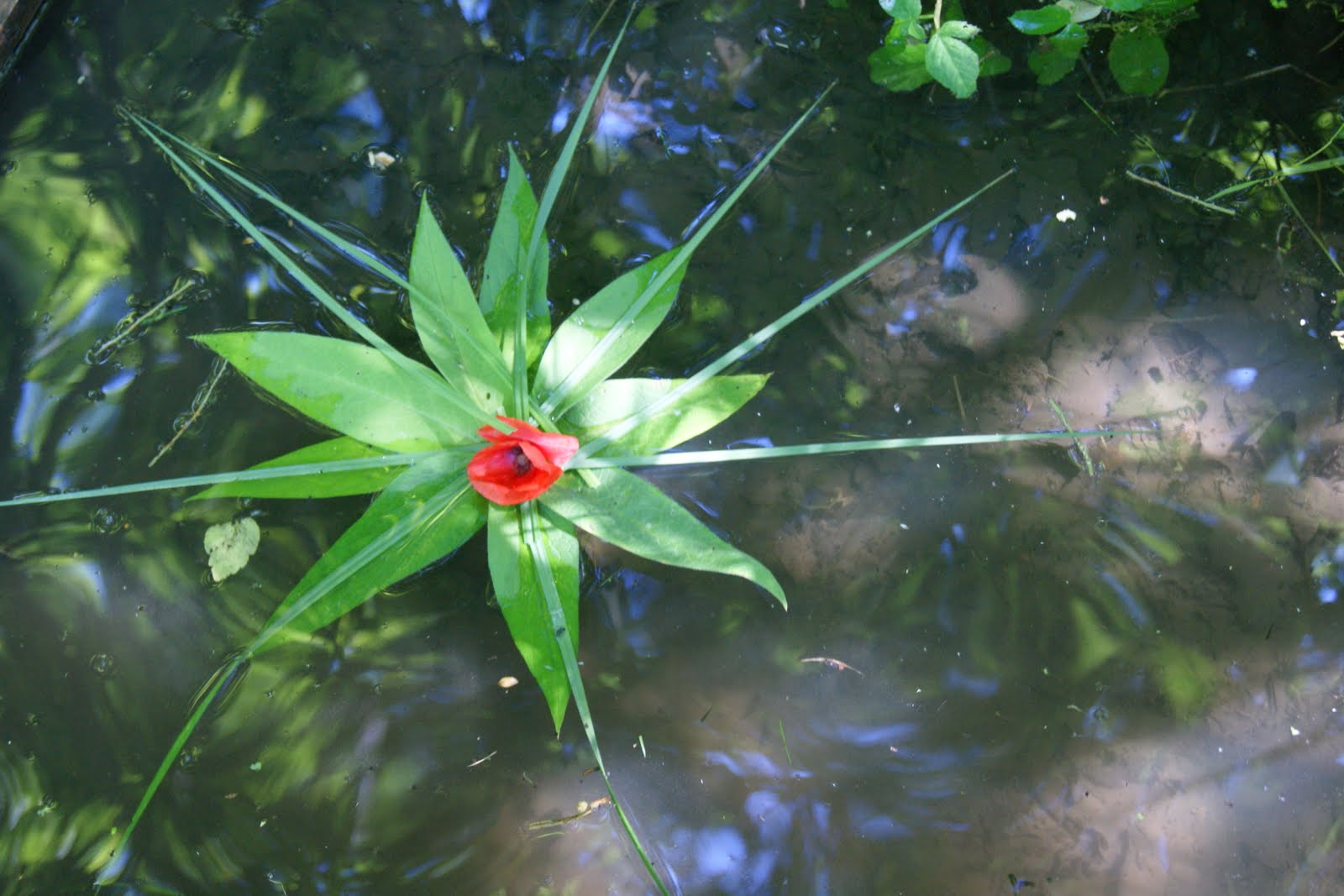 "...Écarter, d'un large revers de main, les lentilles d'eau, sur la mare. Poser trois brins de roseaux en triangle. Entourer le tout de fleurs de pois de senteurs sauvages cueillis dans la friche située au dessus de la voie ferrée..."